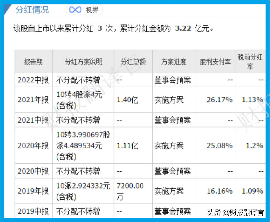 而在这家企业的分红信息中翻译官还得知,公司自上市以来累计分红三次,总共派发现金3.22亿元。