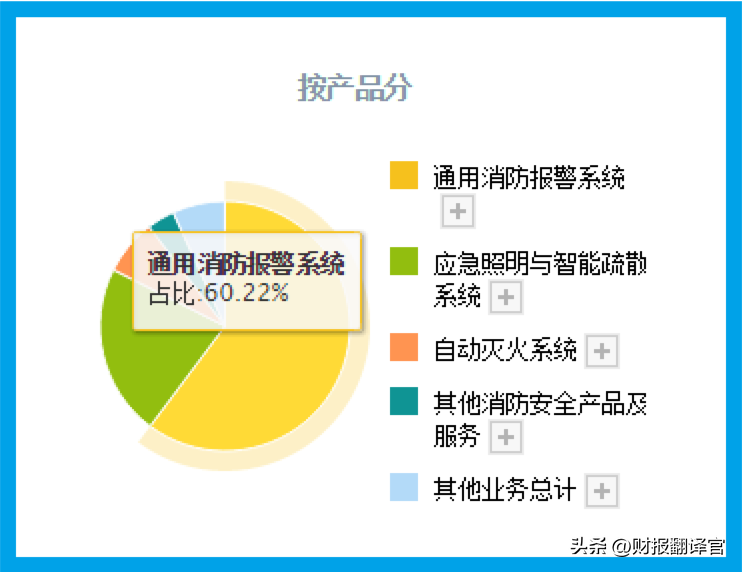 这家企业通用消防报警系统的收入占比为60%,应急照明与智能疏散系统的收入占比为22%,自动灭火系统的收入占比为7%。