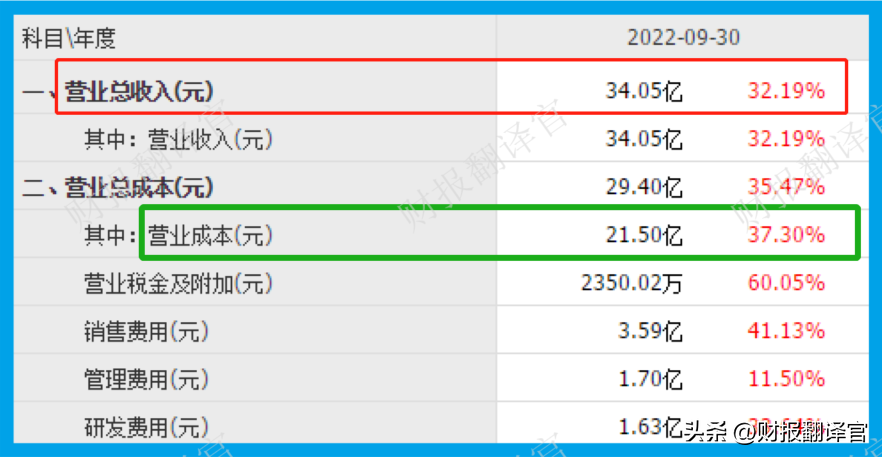 2022年第三季度,公司的营业收入为34.05亿元,同比只增长了32.19%。而对应的营业成本却为21.5亿元,同比大幅提高了37.3%。