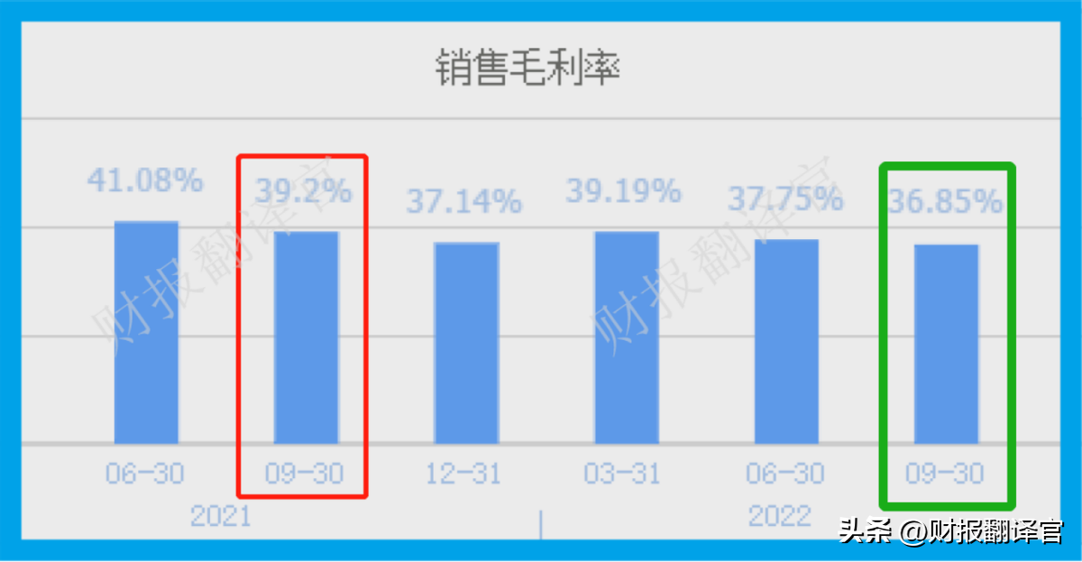 而到了2022年第三季度,该企业同样销售100元的安防产品,却只赚回36.85元的毛利润,销售毛利率降至36.85%,同比下降了6%。