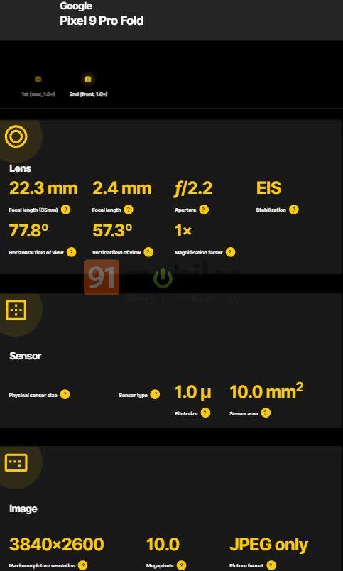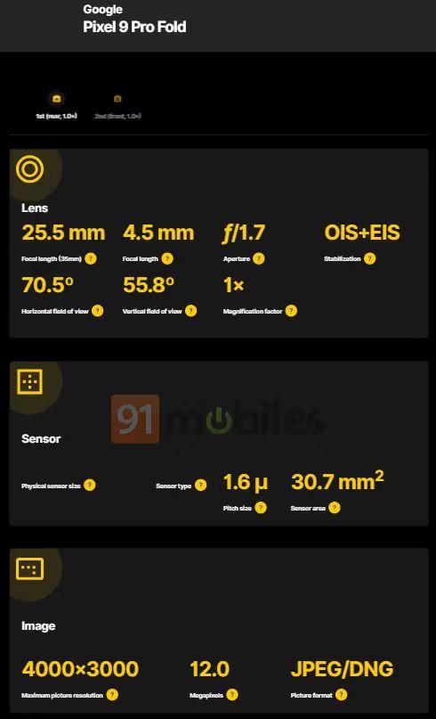 谷歌 Pixel 9 Pro Fold 手机背面配有 4800 万像素主摄 ,页面信息显示在 Pixel-binned 情况下为 1200 万像素。