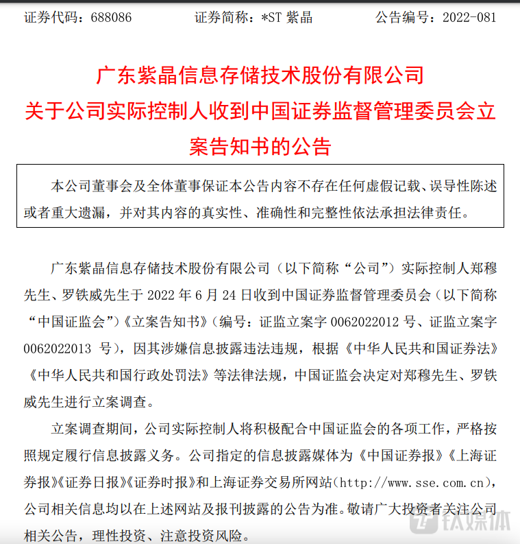 2022年2月11日,证监会因涉嫌信息披露违法违规,对紫晶存储发出《立案告知书》。3月13日,紫晶存储表示公司存在违规担保,累计金额达到3.73亿元。3月15日,上海金融法院受理了投资者诉紫晶存储的证券虚假陈述责任纠纷案件,紫晶存储还被投资者告了。