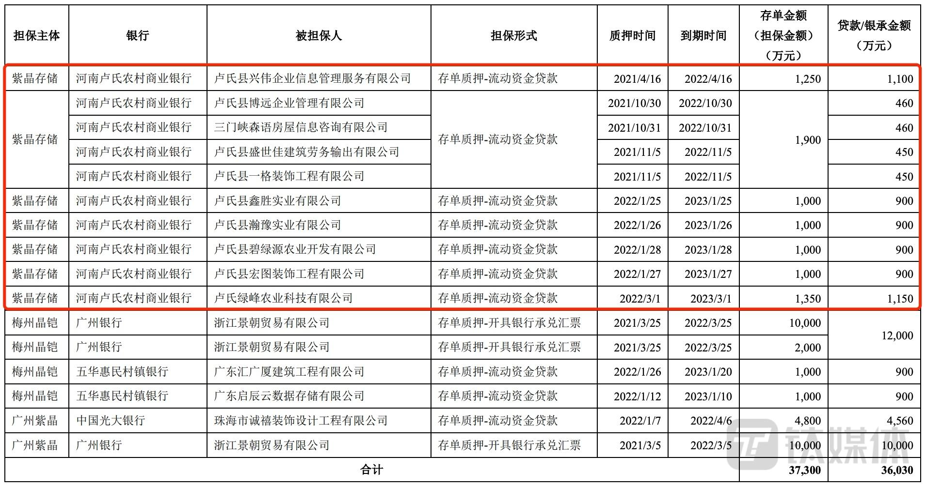 3月25日发布的公告显示,广州紫晶提供的存于广州银行合计1.2亿元存单质押担保已于2022年3月5日到期,相应资金已于3月11日被转至被担保方浙江景朝贸易有限公司的银行账户;4月,河南卢氏农商行和光大银行合计3笔存单质押担保将到期,合计担保金额为6050万元;2022年10月至2023年3月,其他存单质押担保将陆续到期,合计担保金额9250万元。