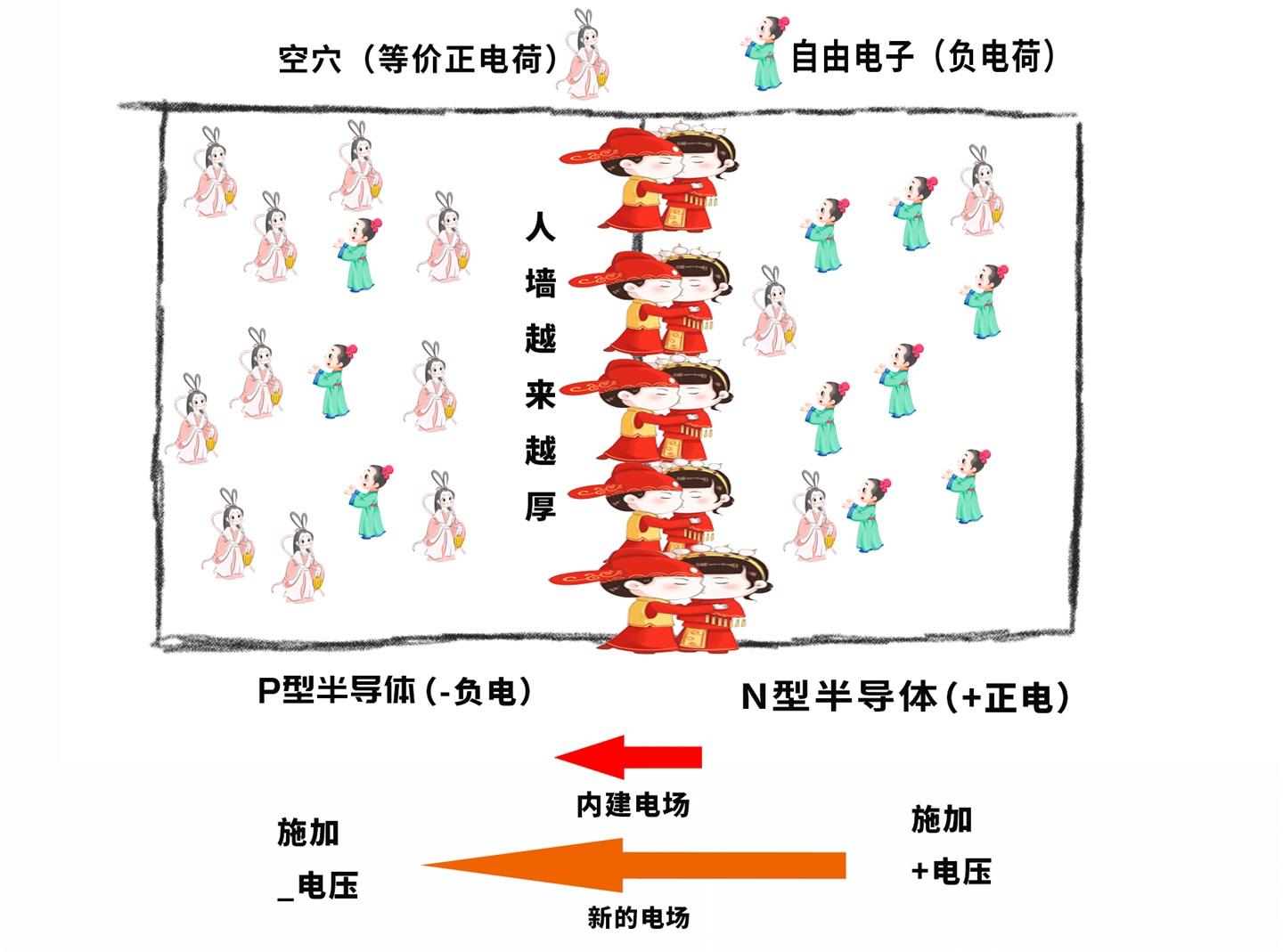 注意,这些过程和上面 “人墙”的形成是动态同步进行的,人们把这种结构叫做 “PN 结”。
