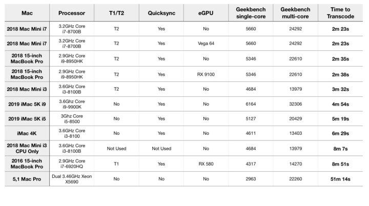 最后一项改进和视频转换有关。Appleinsider 在使用 Handbrake 这款开源视频转码软件时发现,在都使用英特尔 i3 处理器、相同转速硬盘的情况下,集成了 T2 芯片的 2018 款 Mac mini,会比没有 T2 芯片的 2019 款 4K iMac 获得更快的视频转码速度,这在随后的多款设备测试中也得到了验证。