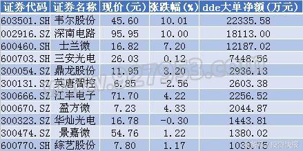 从资金面来看,今日芯片板块再次受到主力资金追捧,共计吸金近8亿,有11只个股获得超千万的大单净额。其中,今日涨停的韦尔股份、深南电路和龙头股士兰微更是获得超亿元的大单净流入。