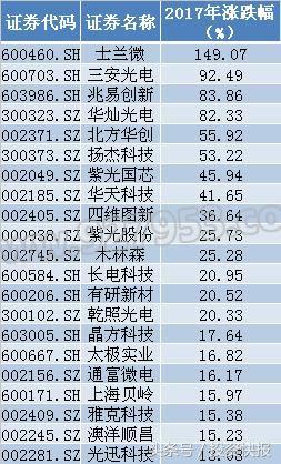 芯片板块上年走势可圈可点,剔除上年以来上市的次新股,有27只个股有不同程度的上涨。其中 士兰微涨幅翻倍, 紧随其后的是涨逾 90%的 三安光电 。 另外,兆易创新、华灿光电、北方华创、扬杰科技、紫光国芯、华天科技、四维图新等涨逾30%。