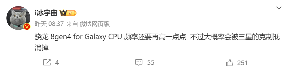 对此,博主@i冰宇宙 近期给出了确切消息。他称,尽管骁龙8 Gen4 for Galaxy的CPU频率很高,但三星的调校比较克制,因此实际体验跟普通版差别不大。