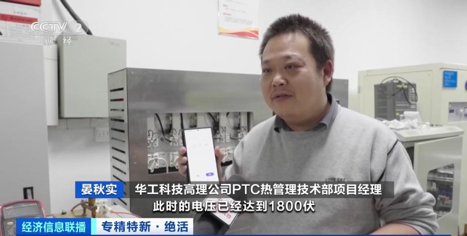 华工科技高理公司PTC热管理技术部项目经理 晏秋实: 随着时间来到第10分钟,此时的电压已经达到1800伏,高抗电压强度的PTC陶瓷芯片,仍然处于一个正常工作的状态,没有发生击穿或开裂的情况。