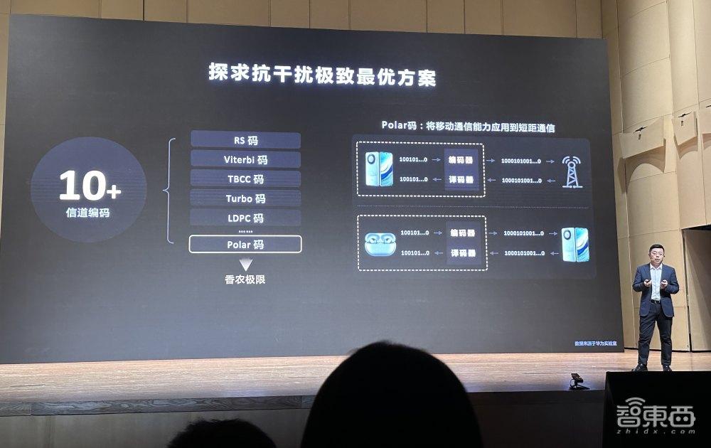 在抗干扰方面,华为的音频研发团队发现,Polar码效率最高,刘东方称,Polar码的编码效率接近于香农极限,基于此,相比于友商产品,麒麟A2芯片的传输抗干扰能力提升2倍,室内外传输距离提升了20%左右。