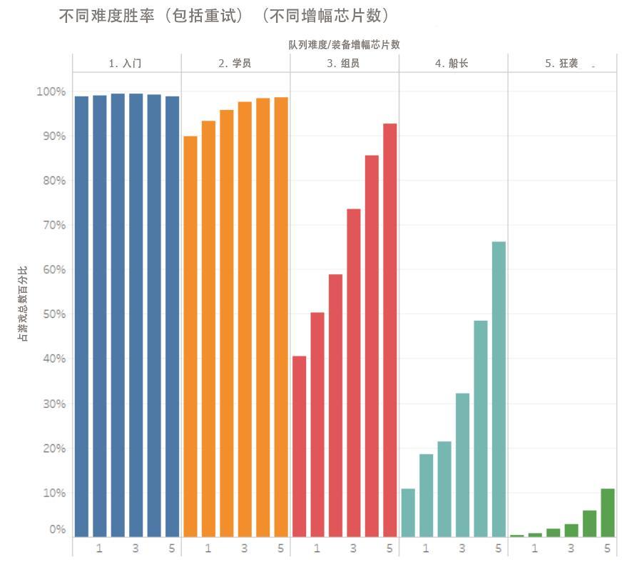 举例来说,我们很高兴看到组员难度的胜率由零增幅芯片时的40%跃升至五增幅芯片时的90%以上。另一方面,狂袭难度下零增幅芯片的胜率为0.2%,但是这些胜利大多数的时候是由于队伍中一名玩家没有装备增幅芯片,而他的队友都装备了4-5个带他通关。
