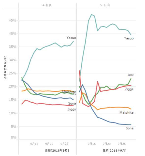 吉格斯的使用率很有意思。因为最初他曾被认为是这个模式中最弱的英雄,可以看到他的使用率掉得相当快。不过在“角落W”的打法被发现后,他的登场率飞速提升,然后在被削弱后又有所下滑。不过之后他的使用率依然在缓速攀升,因为有玩家需要用他来完成娑娜/吉格斯的任务,而吉格斯显然是二者之中更简单的选择。娑娜的攻击力对于狂袭难度来说可能是太弱了,因此使用率也在不断下降。