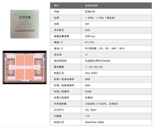 龙芯 3A3000 是龙芯 3 号系列处理器的最新升级产品,基于龙芯 3A2000 设计,进行了结构上的少量改进,增加处理器核关键队列项数,扩充片上私有/共享缓存容量等,有利于同主频性能提升。