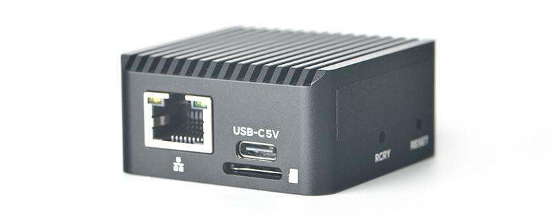 该开发板尺寸 45mm 见方,厚 1.2mm,支持 0℃~+80℃ 工作环境温度 ,正面配备 8Pin UART 调试串口、一个支持 5V 供电的 USB Type-C 接口、一个千兆 RJ45 网口、eMMC 焊盘和一个 USB 2.0 Type-A 接口。