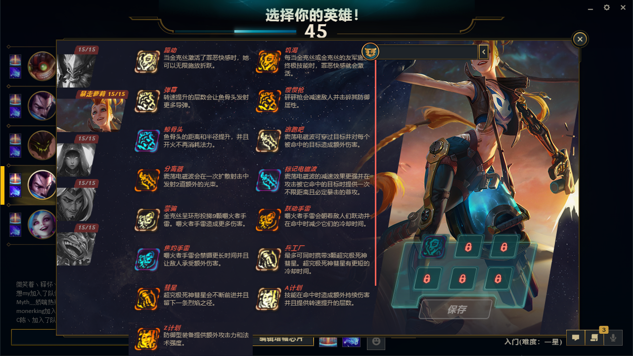 英雄配置:琴女,剑豪,炸弹人必不可少,也可以重复选择英雄