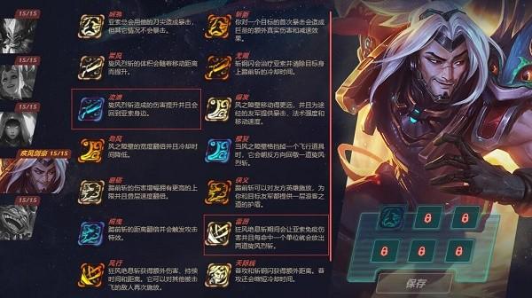 雷厉:使用狂风绝息斩期间,亚索免疫所有伤害并且无法被选定,落地时,亚索会向每个命中的目标各施放两阵龙卷风,每命中一次减少狂风绝息斩的冷却时间10%(最多减少50%)