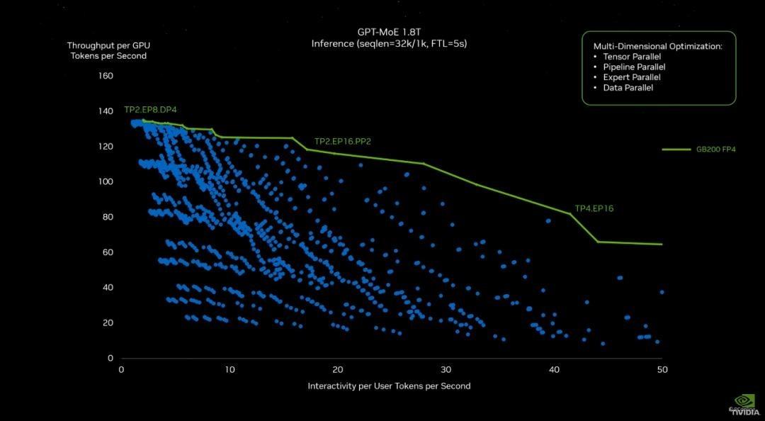 而两个B200 GPU与Grace CPU结合就成为今天“火热”的GB200超级芯片。这款超级芯片的性能更加惊人,你以为H100已经很快了?不!GB200更快,过去,在90天内训练一个1.8万亿参数的MoE架构GPT模型,需要8000个Hopper架构GPU。现在,你只要2000个Blackwell GPU就可以完成。