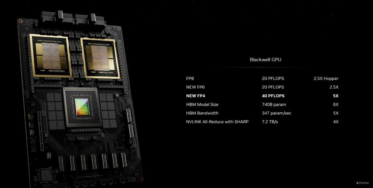 而老黄在大会上则表示“Blackwell不是一个芯片,它是一个平台的名字。”意思是Blackwell架构将同时用于以上两种类型的产品。借助这一架构,NVIDIA将推出涵盖多个应用领域的显卡,即RTX 50系显卡也会是这个架构。并且从老黄手上的芯片可以看出,新的Blackwell GPU的体积明显比上代Hopper GPU要更大一些。