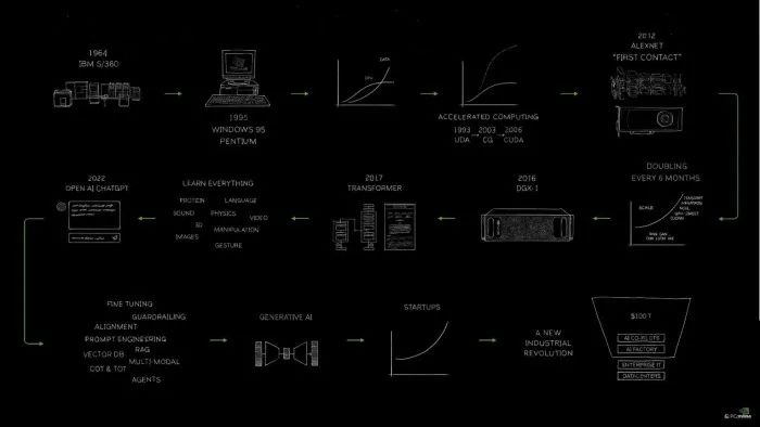 峰会伊始,我们熟悉的皮衣刀客准时出场。一上来就直奔今天的主题——AI,并表示“加速式计算机的生产力已经到达了一个转折点,生成式AI正在加速发展,而我们需要以一种全新的方式进行计算,才能够进一步提高计算机生产力。”