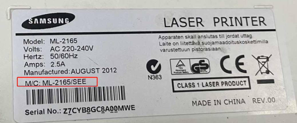 侧面标签:(ML-2165)是型号,分号后面的(SEE)是打印机编码