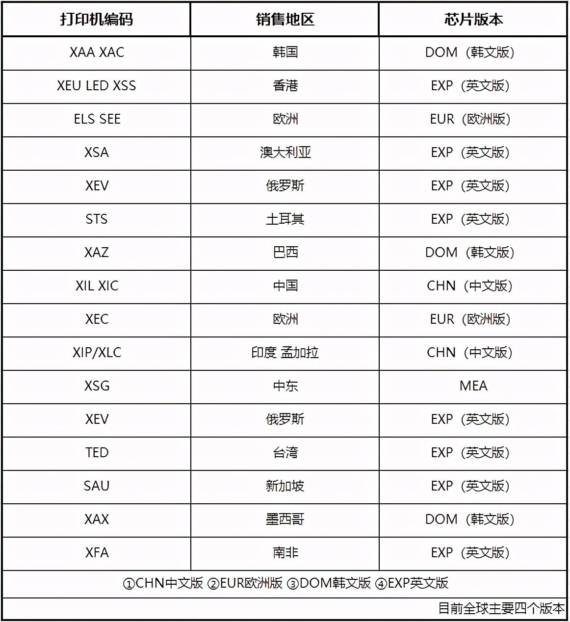 例:XIL打印机编码对应的芯片版本(销售地区)为CHN就是中文版