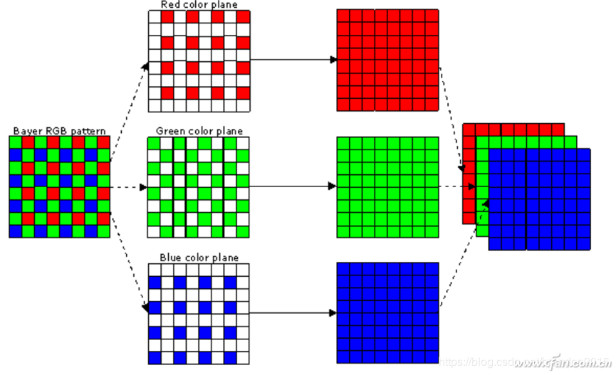 CMOS传感器本身其实是个“色盲”,如果只靠它输出的照片都是黑白的,想要记录颜色,还需要搭配一个名为Bayer(拜耳)色彩滤波阵列(Bayer Color Filter Array,CFA)的滤光板,并将其覆盖在一个感光板上。Bayer色彩滤波阵列的结构主要以RGBW、RWWB、RGGB和RYYB为主,但由于拜耳阵列中的每一个像素只能采集一个颜色通道信息,另外两种颜色信息需要通过插值算法,结合相邻其他颜色的像素信息才能组成一个完整的色彩,这个有点类似于“去马赛克”的过程,就需要依靠ISP内的Demosaic插值算法模块实现。