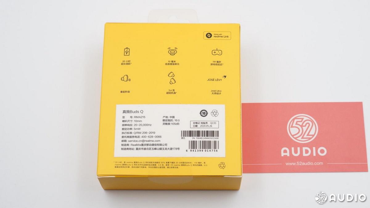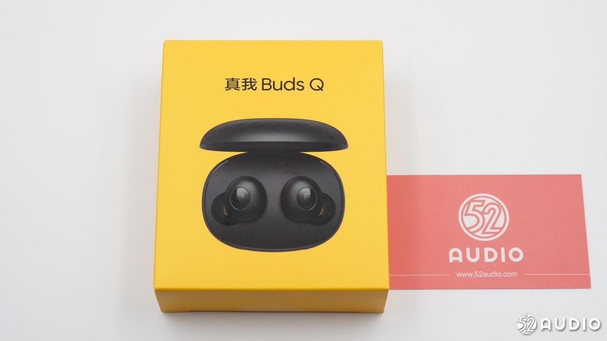 包装盒依旧是realme标志性的黄色,这次国内版本直接使用品牌名“真我”,顶部是产品名“真我 Buds Q”,下面是耳机在充电盒内的渲染图。