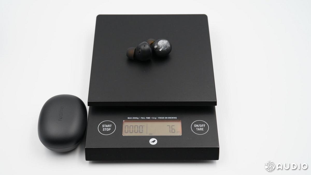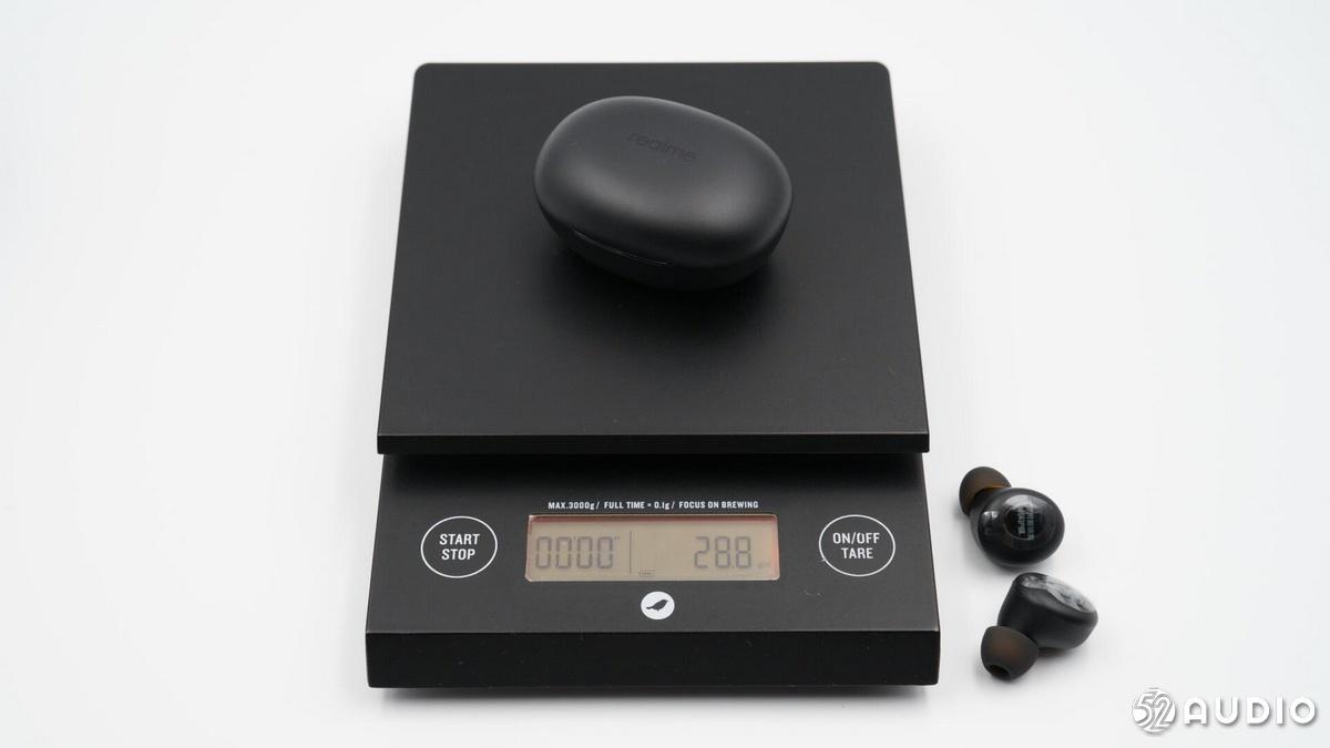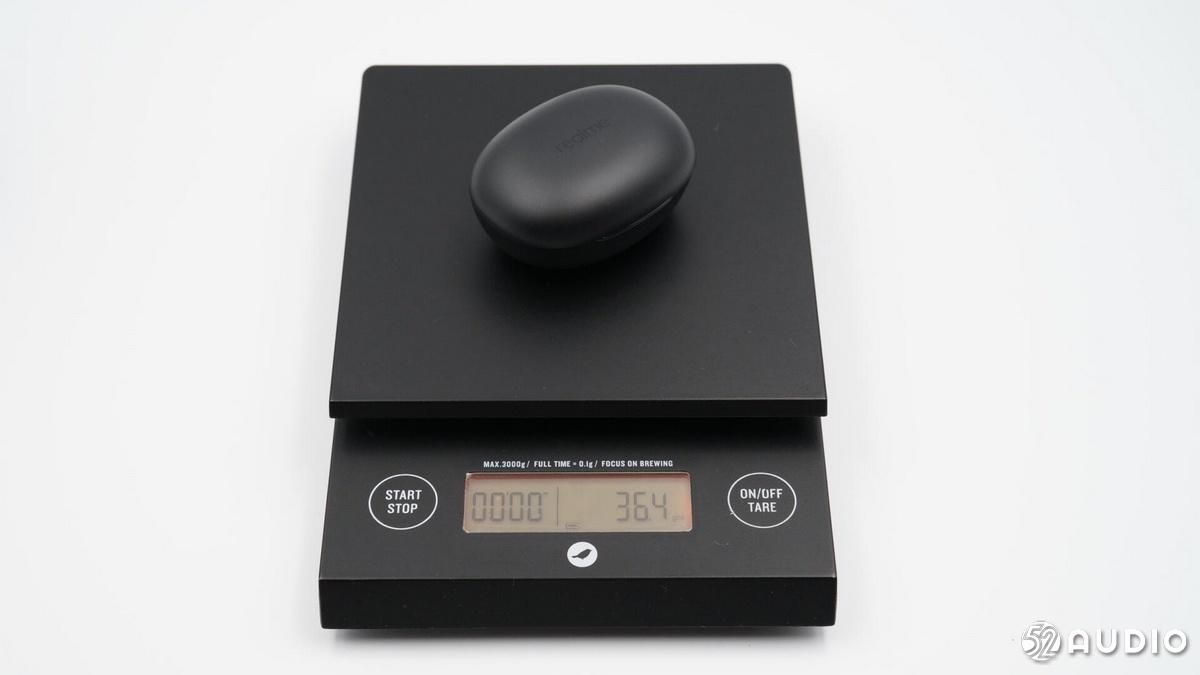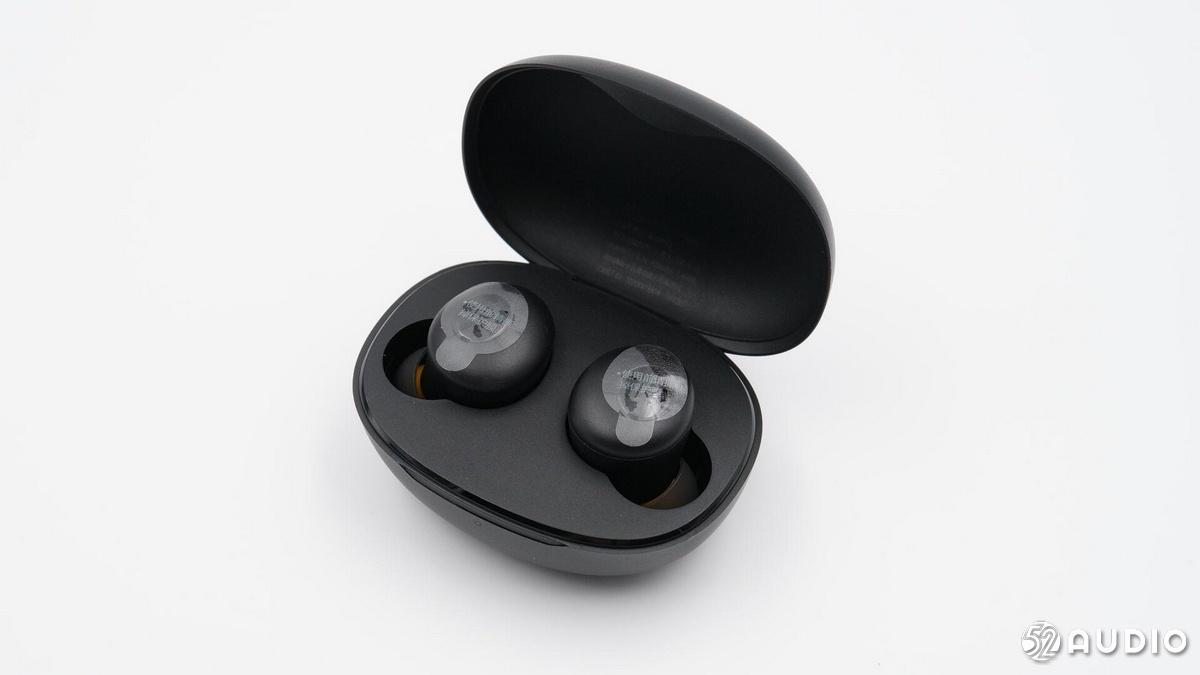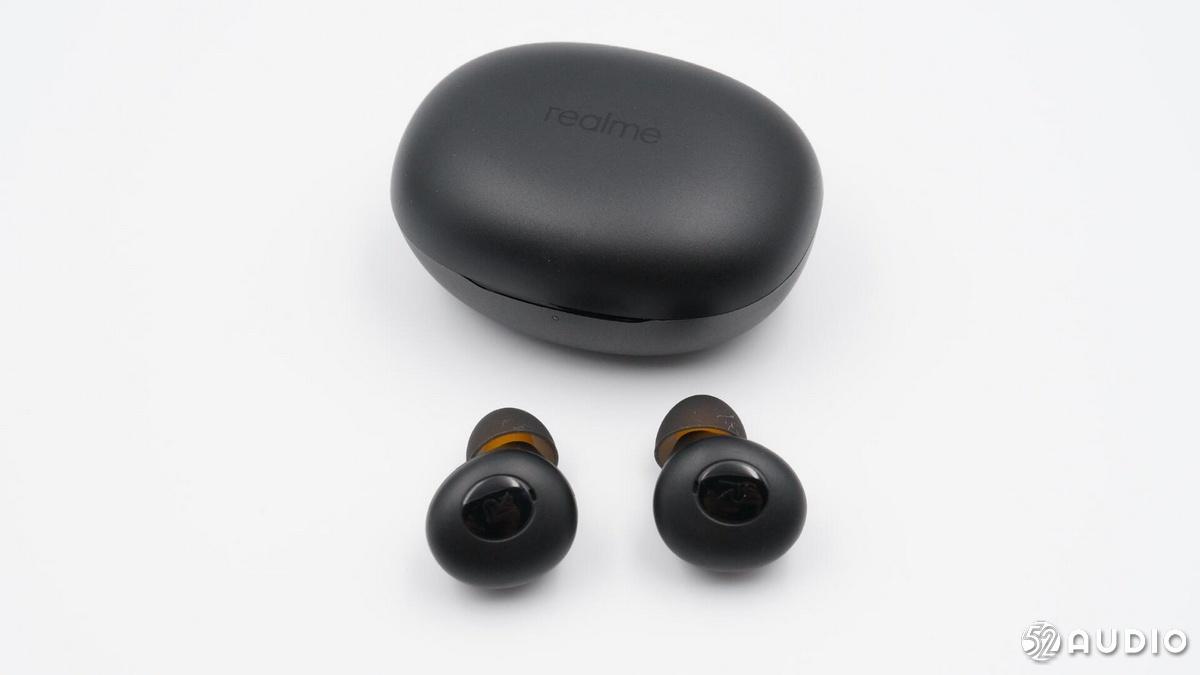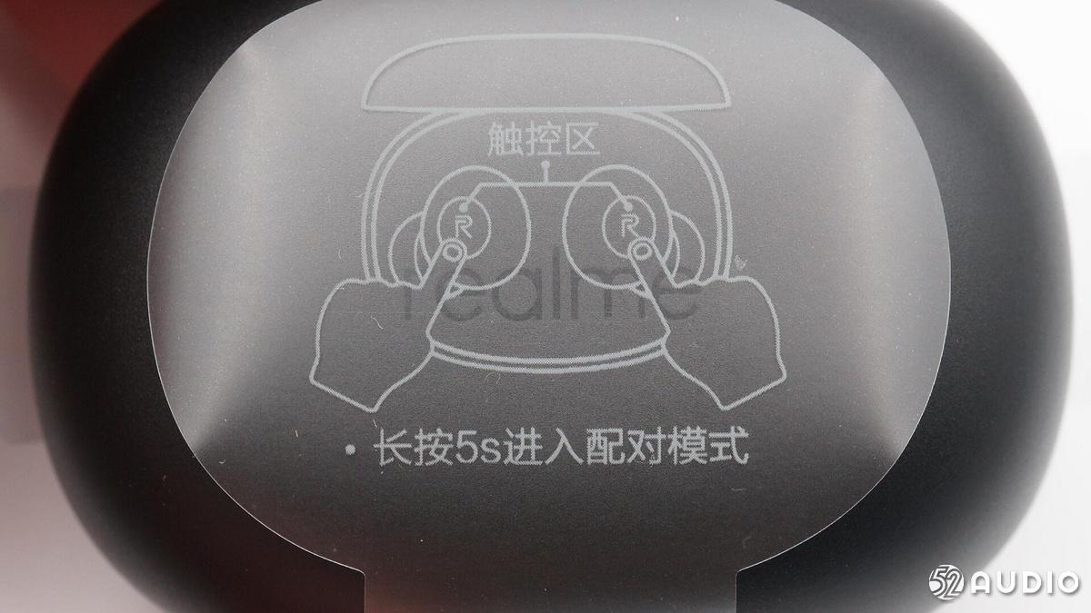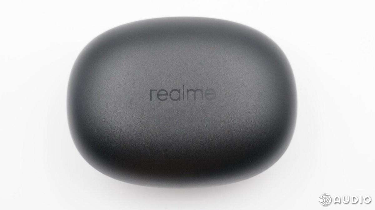 充电盒的确比常见的产品看上去要更圆润一些,盒盖上有“realme”的品牌名。