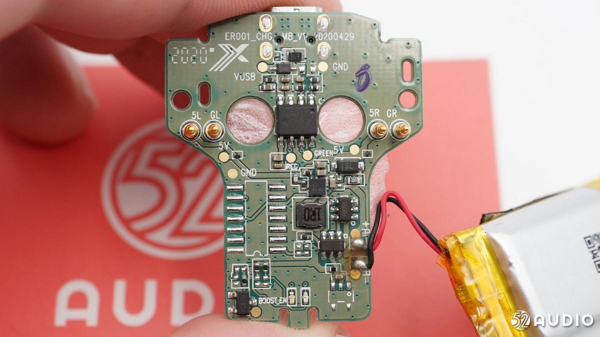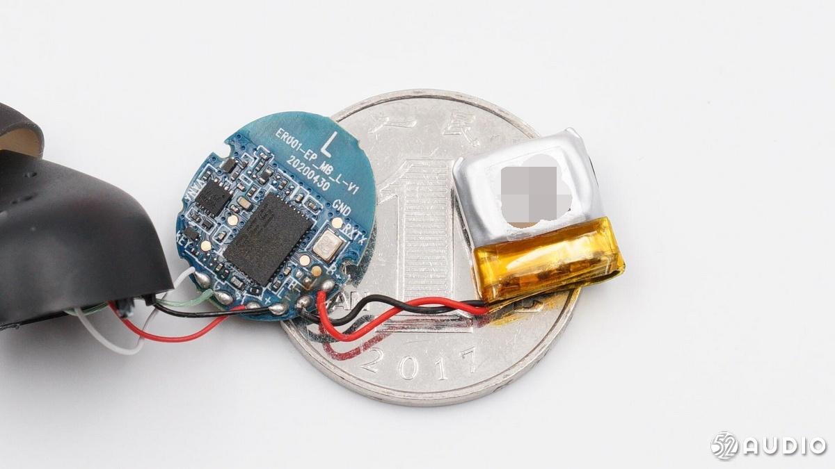 沿合模线拆开耳机,主板+软包电池+扬声器单元的结构。