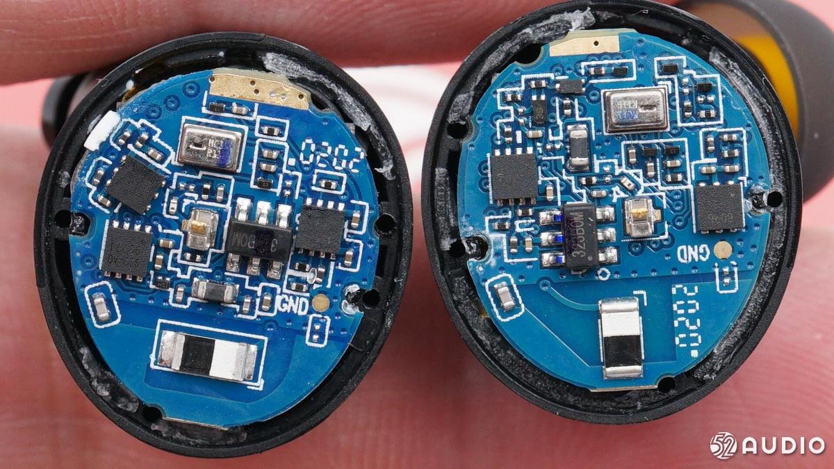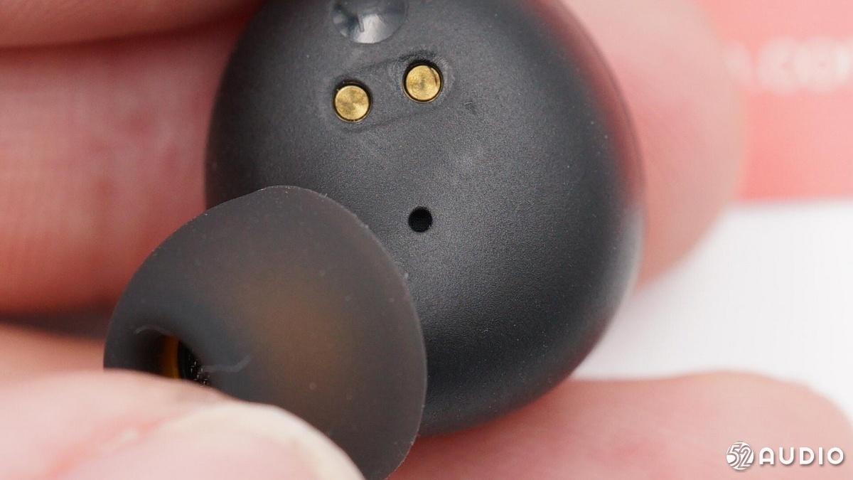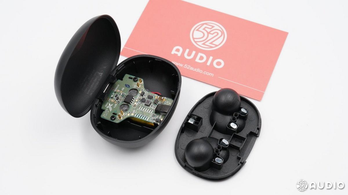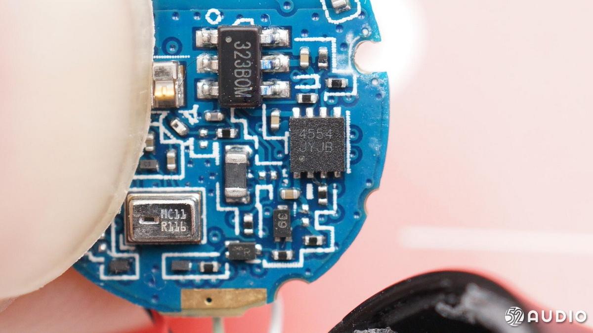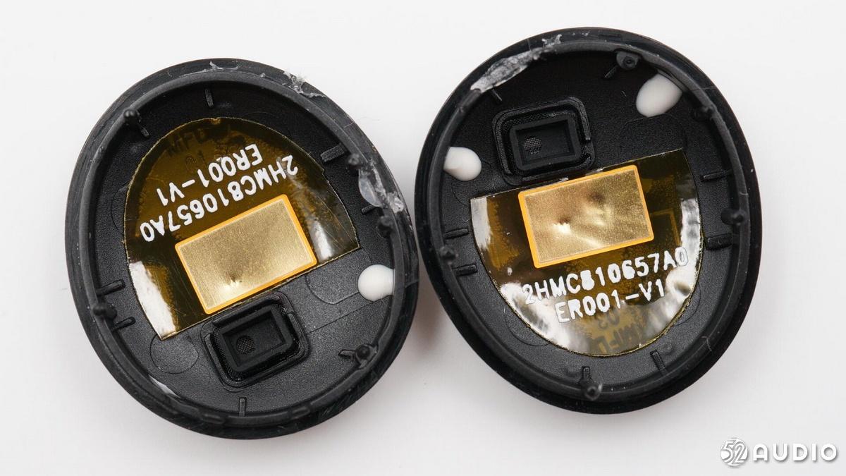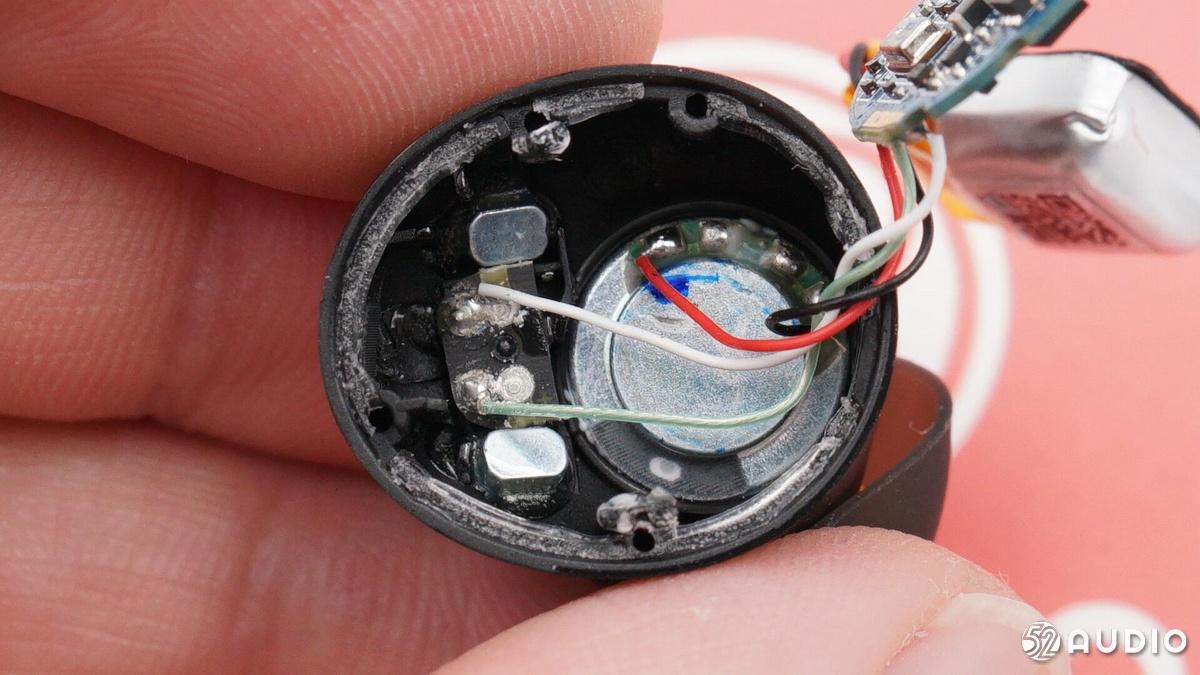 最后来看一下音腔内的布局,左侧有两个吸附充电盒的磁铁,磁铁中间是充电触点所在的小板,右侧是扬声器单元,两者均通过导线与主板相连。