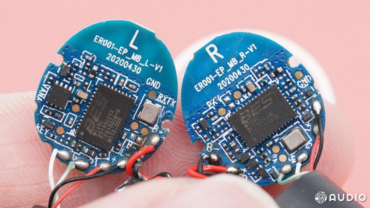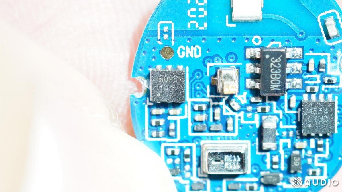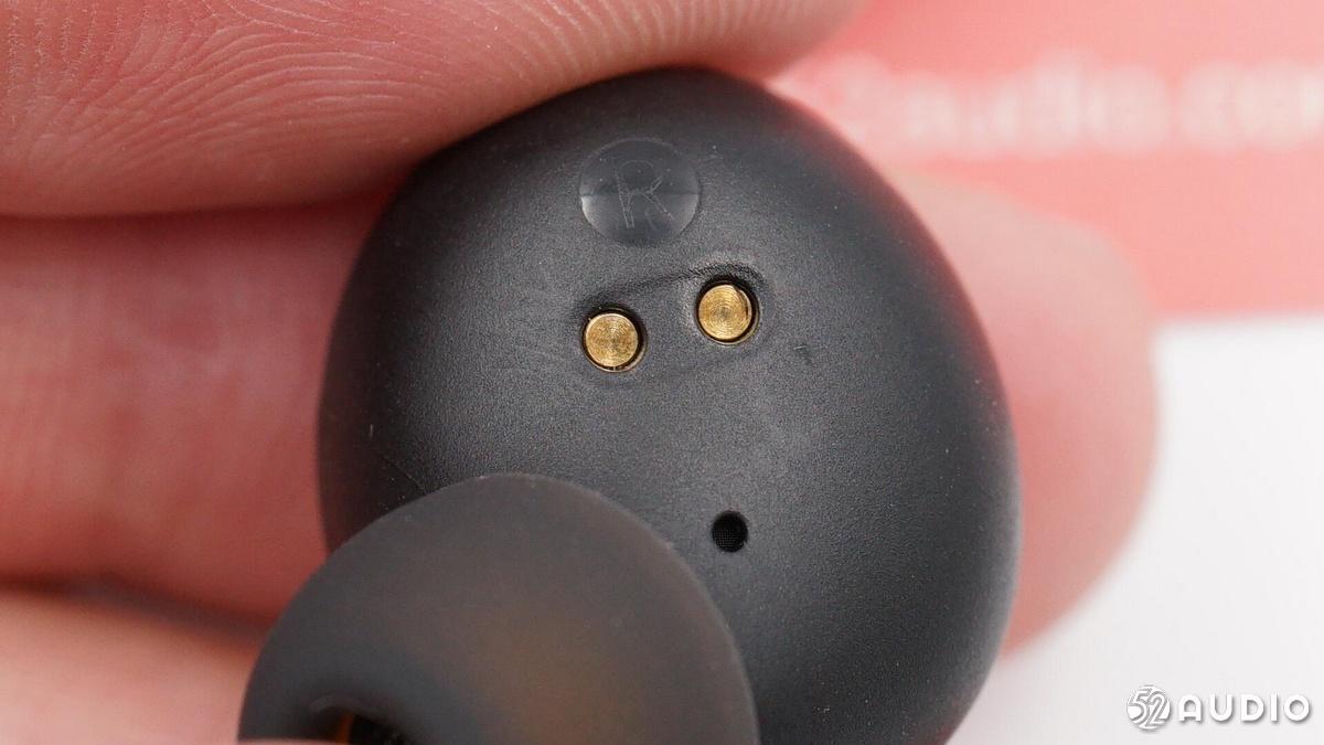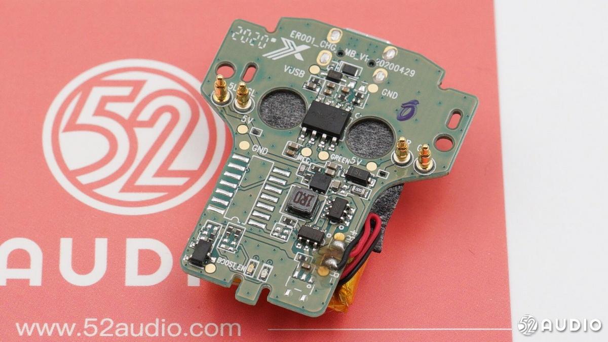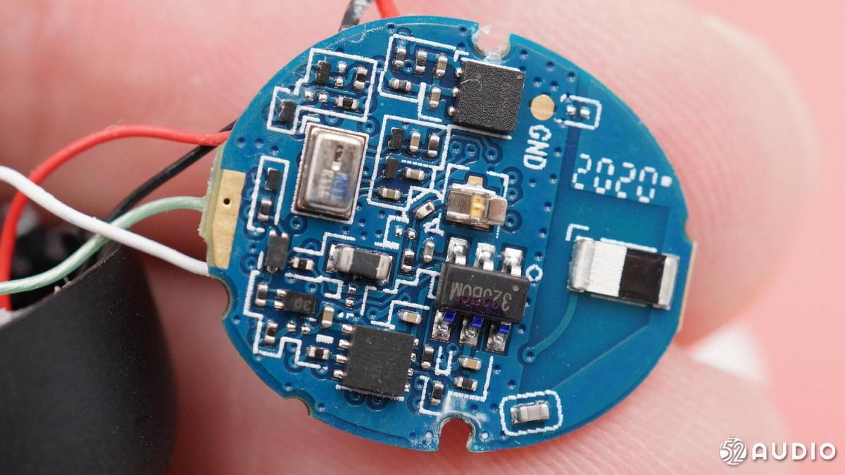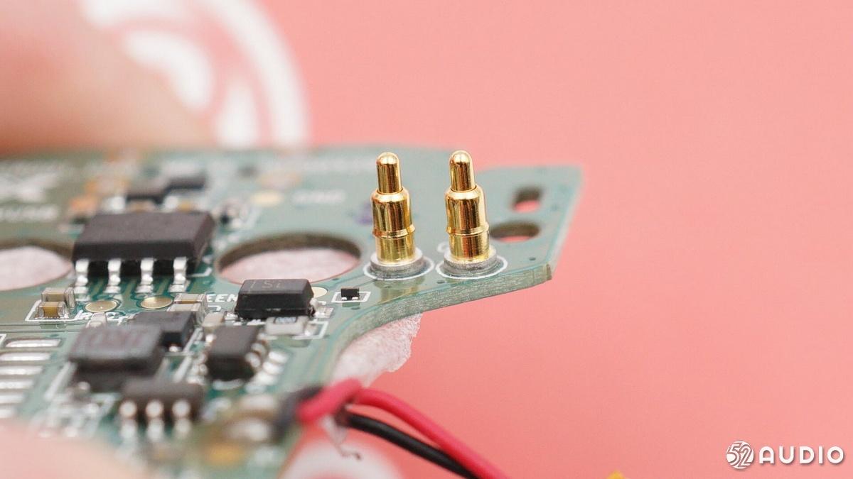 最后来看一下音腔内的布局,左侧有两个吸附充电盒的磁铁,磁铁中间是充电触点所在的小板,右侧是扬声器单元,两者均通过导线与主板相连。