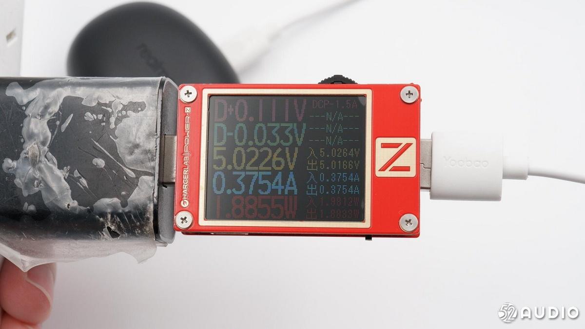 我爱音频网采用ChargerLAB POWER-Z KT002便携式电源测试仪对realme真我 Buds Q 真无线蓝牙耳机进行有线充电测试,充电功率约为1.9W。