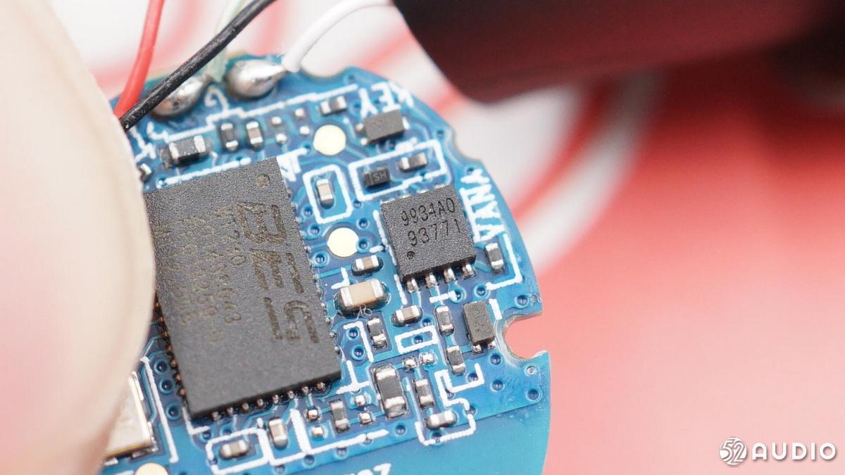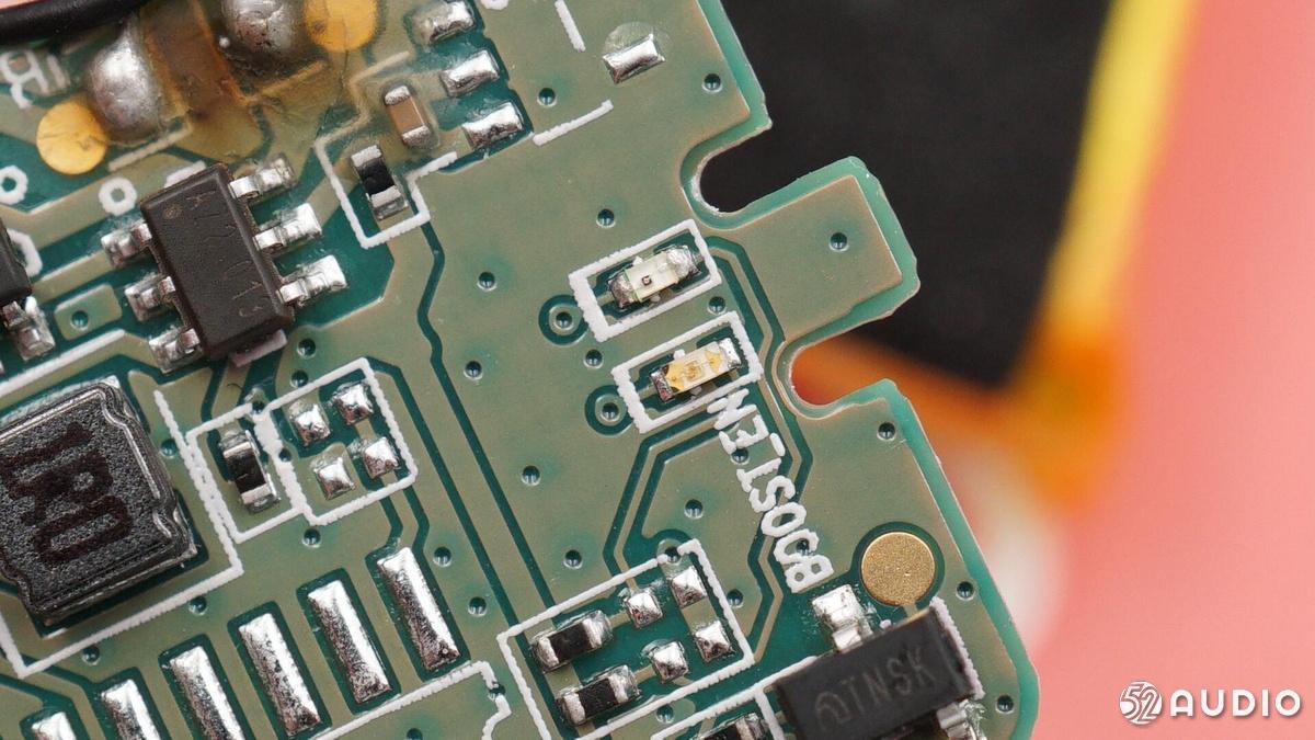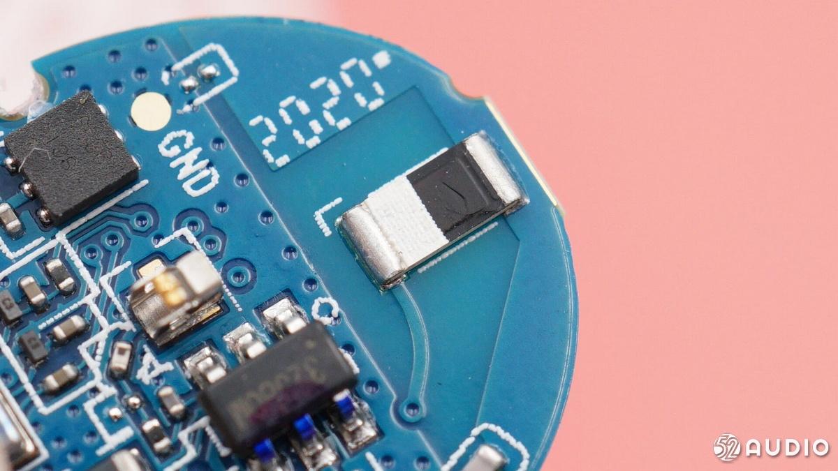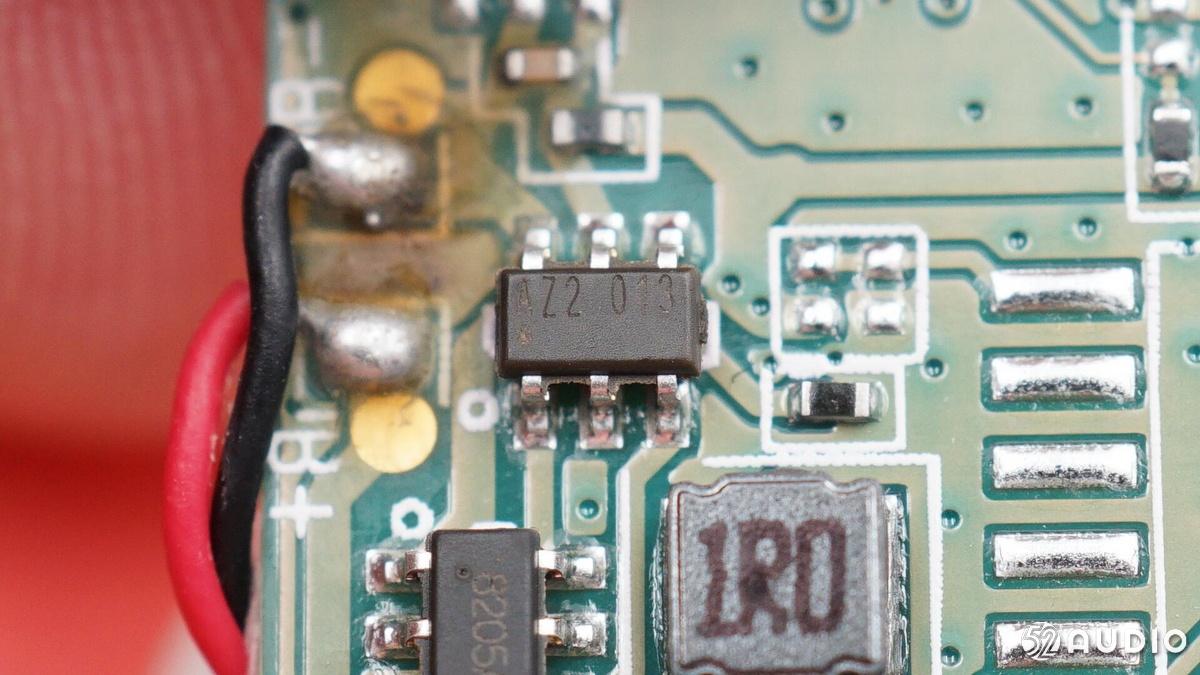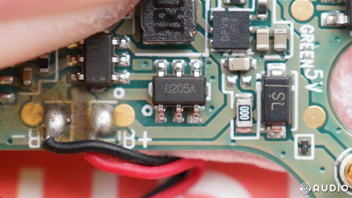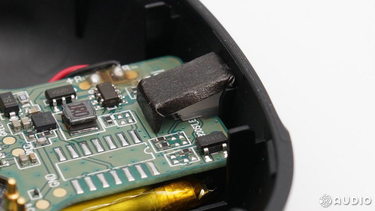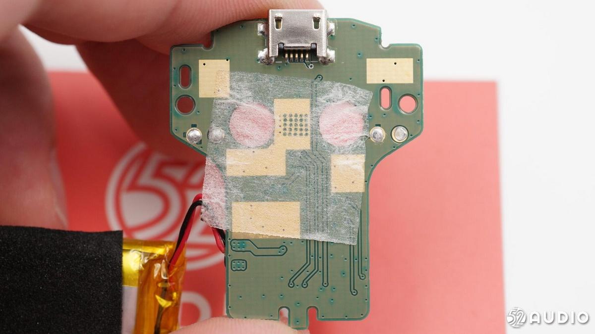 顶部是Micro-USB电源输入接口,中间部分有一颗充电IC,负责给电池充电,下面电池导线焊接处有电池保护电路和升压电路,为耳机充电。