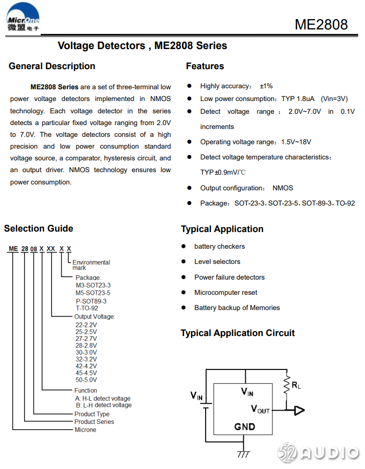 微盟 ME2808,电压检测器IC,检测电池电压,并在电池电压低的时候关闭升压输出。