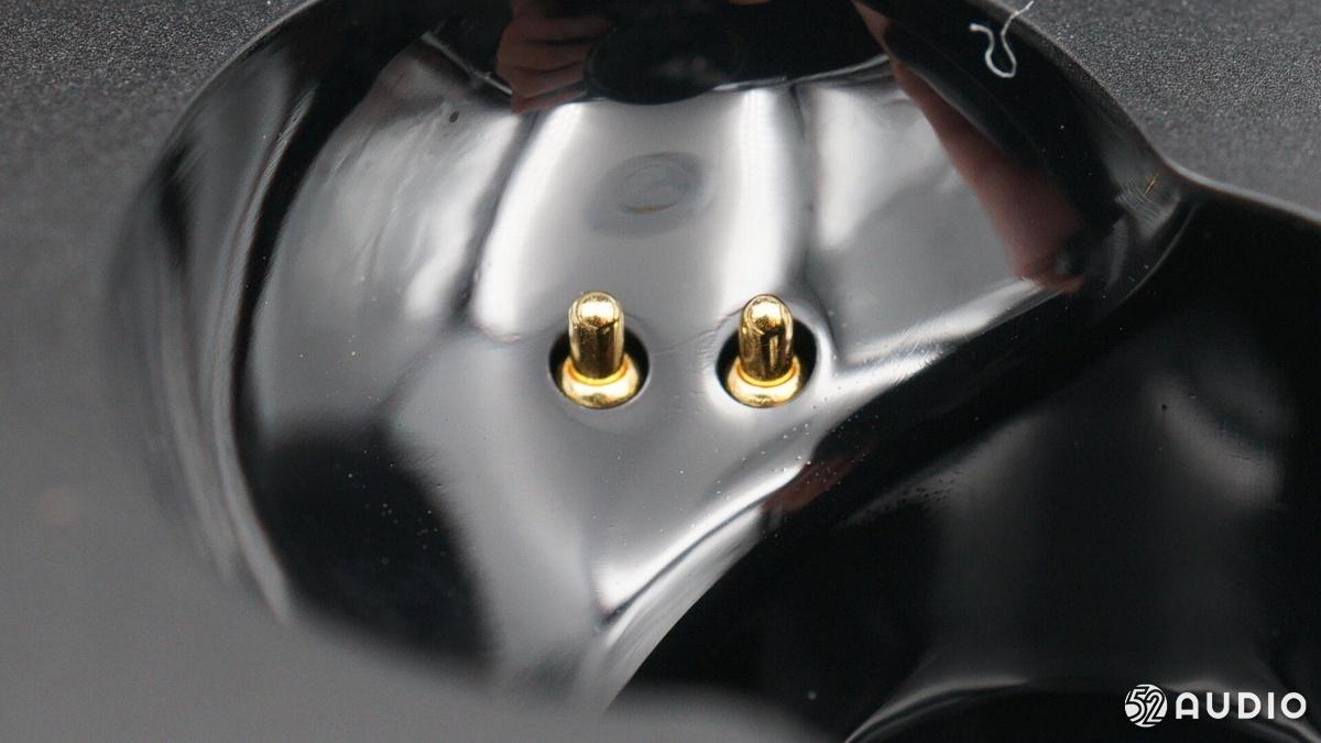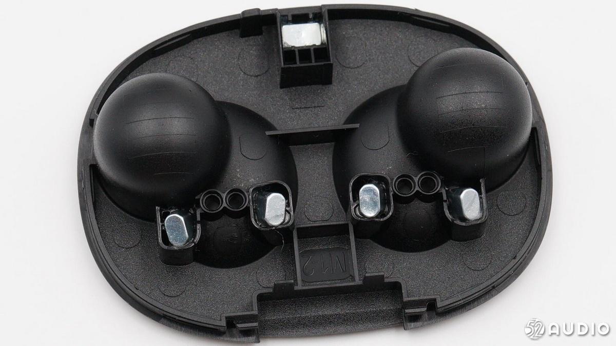 充电座舱内侧展示,单个耳机有两个磁铁用来固定,开合处还有一个磁铁吸附盒盖。