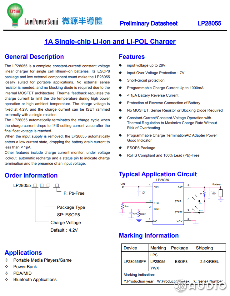 LPS微源半导体 LP28055,1A锂电池线性充电IC,最高耐压28V,输入过压保护7V,为充电盒内置电池充电,耐压28V,省掉了外接的输入过电压保护元件。据我爱音频网拆解了解到,据我爱音频网拆解了解到,已有漫步者、JLab、小米、摩托罗拉、OPPO、QCY、联想、荣耀亲选声氏Earbuds等知名品牌的TWS耳机充电盒都大量采用了微源的电源方案。