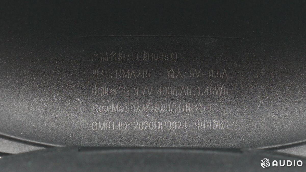 盒盖内侧的产品信息,产品名称真我 Buds Q,型号RMA215,输入5V⎓0.5A,电池容量400mAh/1.48Wh,额定电压3.7V。