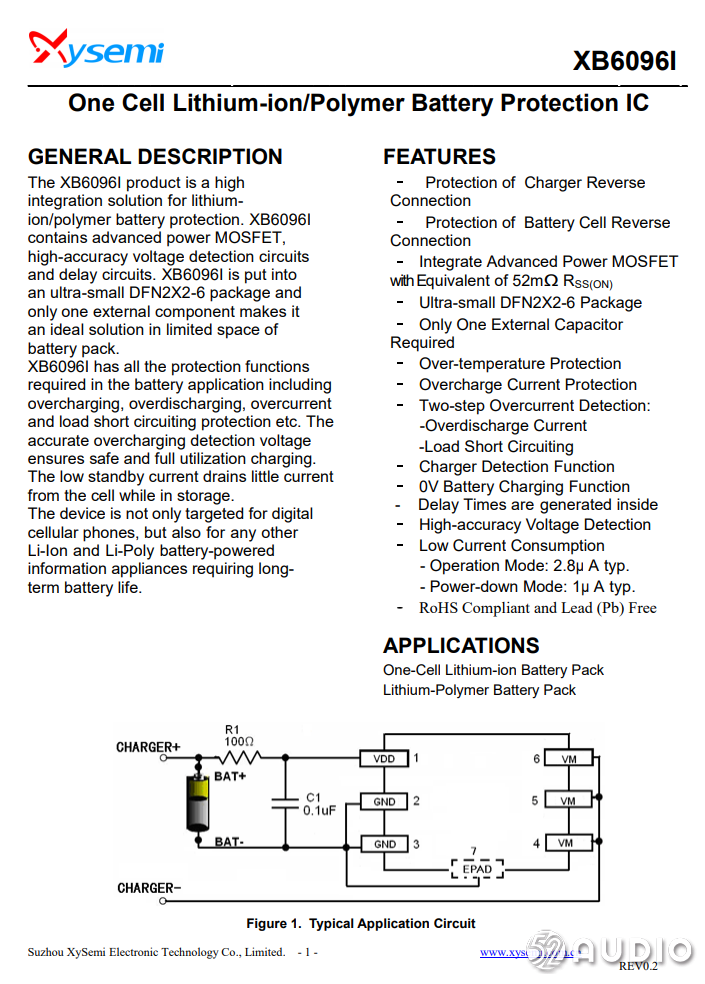 赛芯微 XB6069I 锂电池保护IC,用于耳机内部锂电池过充过放保护。