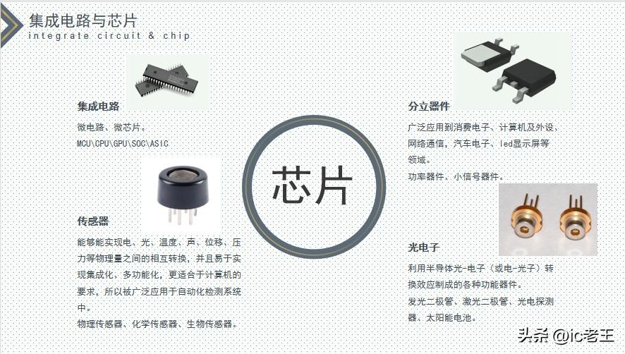 而芯片除了包含集成电路之外,还包含:分立器件 、传感器 和光电子器件 。