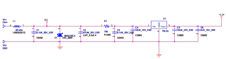示例的台灯方案采用杰力科创DLT8SA20A触摸芯片,它的MCU供电为DC3.3V,对应的电源部分电路可参考如下原理图.