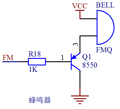 上图为蜂鸣器的典型驱动电路,如果选择的BELL是无源他激型,通常需要FM输出方波驱动,一般频率为4Khz。如果选择的BELL是有源自激型,FM只需要给高电平就可以驱动BELL发出报警声了。