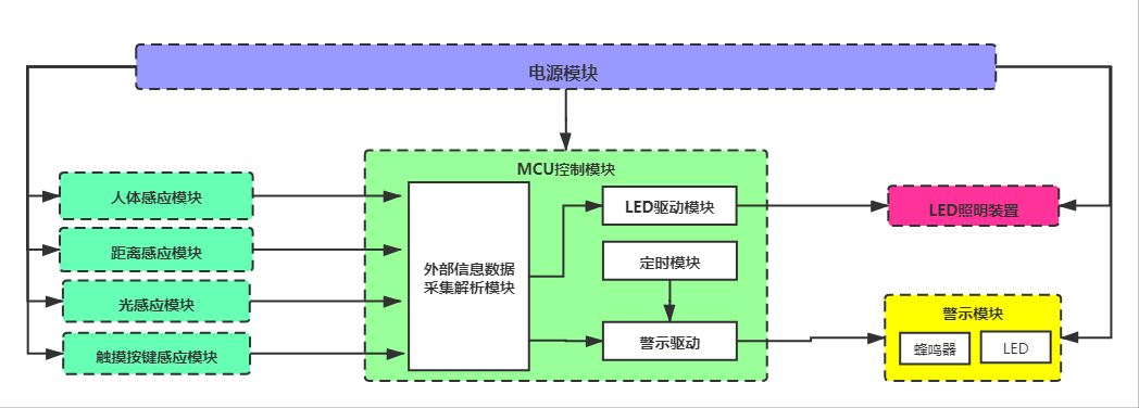 该模块是控制器的核心部件,MCU控制模块通常包含外部信息采集与处理模块(按键扫描处理,人体感应检测与处理,距离感应检测与处理,光感应检测与处理),定时模块,LED驱动模块,以及警示驱动模块(LED报警驱动,蜂鸣器驱动)等。