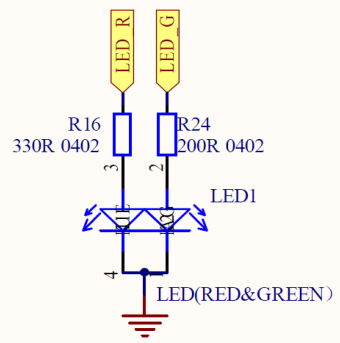 上图是MCU的IO口直接驱动LED了,因为LED的工作电压电流很小,通常10mA就可以了,3.3V的MCU的VDD是可以直接驱动这个红绿双色LED了。