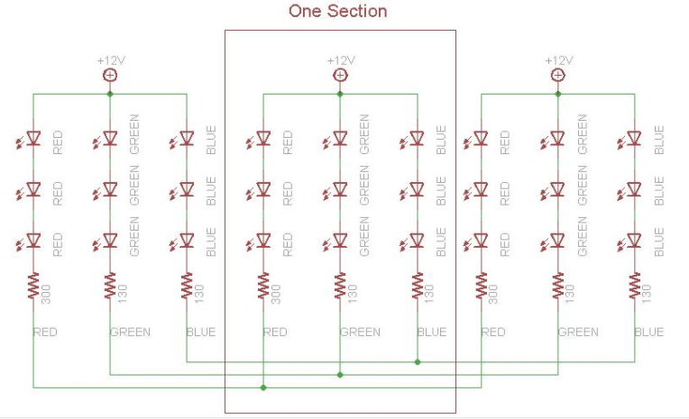 led照明装置最常用的规格是12V和24V两种电压,12V的是3串多路并联结构、24V的是6串多路并联结构。下图是12V的RGB灯条原理图示例