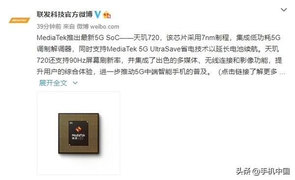 联发科天玑720中端芯片发布 7nm制程支持双模5G