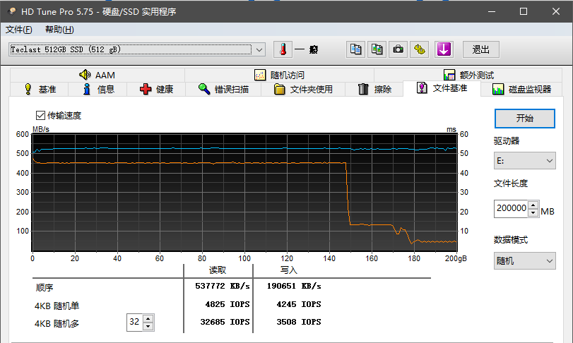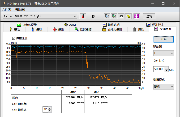 虽然这是一块定位入门级的SSD,我们还是用HD Tune Pro简单测试了一下它的SLC Cache的大小以及缓外速度。通过调节测试测试文件长度,测得在空盘状态下的SLC Cache为150GB左右,这在512GB SSD中算是很大了,超过150GB以后的缓外速度就是QLC的真实成绩了,写入基本在40-50MB/s之间。而当SSD占用了一半的存储空间之后,动态SLC Cache大小掉至28GB,这个时候再复制超大文件就比较吃力了,但对正常使用影响不大。