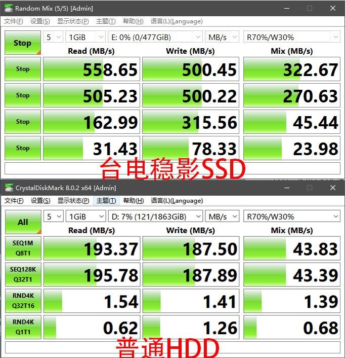 性能方面,官方给出512GB版本的数据是连续读取520MB/s、连续写入480MB/s。经过实测,在CrystalDiskMark软件测试中的顺序读取速度558.65MB/s,写入速度500.48MB/s,成绩略超过官方数据,而在能体现出固态硬盘日常运行状态情况下的七读三写混合测试中,也达到了322.67MB/s的速度。作为对比,下面有小编自用的一块7200转普通HDD(机械硬盘)的测试成绩,前者的读写性能接近后者的三倍,随机4K读写更不在一个等级上。