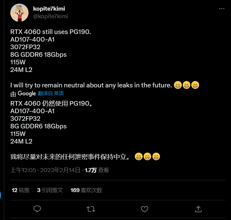 IT之家 2 月 14 日消息,爆料者 @Kopite7kimi 今天给出了 NVIDIA GeForce RTX 4060 桌面显卡的部分规格。