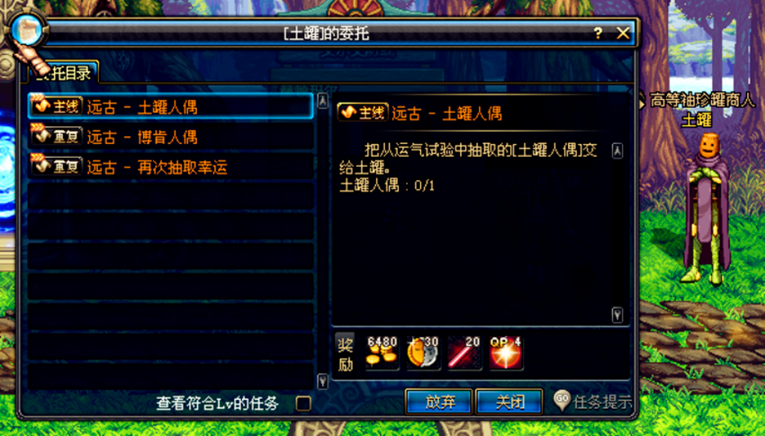 远古-土罐人偶任务。玩家通过开启命运试验胶囊抽取土罐人偶完成任务,开启胶囊会有3个结果:一种是开罐之王称号,一种是土罐人偶(开机械牛地图的任务品),一种是博肯人偶(失败物品)。如果抽不出土罐人偶,后面的主线,新副本和觉醒任务都无法完成,只能再花3w游戏币和3个红色大晶体再次抽取。