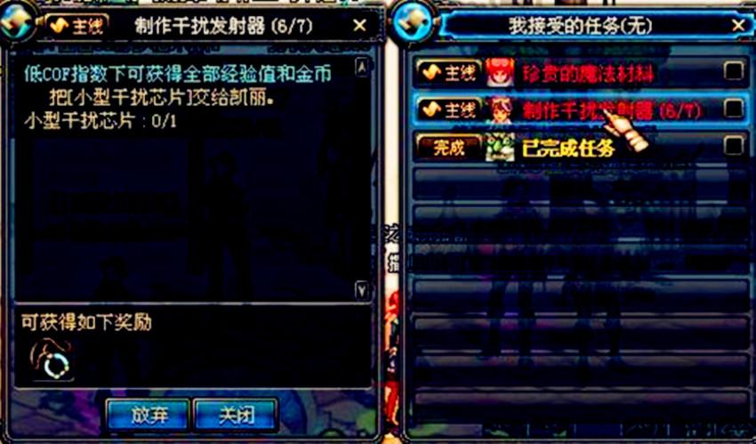制作干扰发射器任务。玩家通过开启压缩胶囊抽取小型干扰芯片完成任务,开启后会开出3种结果:黑硬的物质、小型干扰芯片和次品芯片。如果抽不出,需要给凯丽2个白色大晶体,10个耀眼的结晶,然后再去找夏洛克交1w游戏币,再次获得压缩胶囊重新抽取。